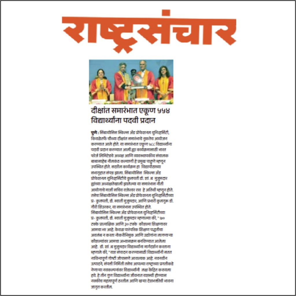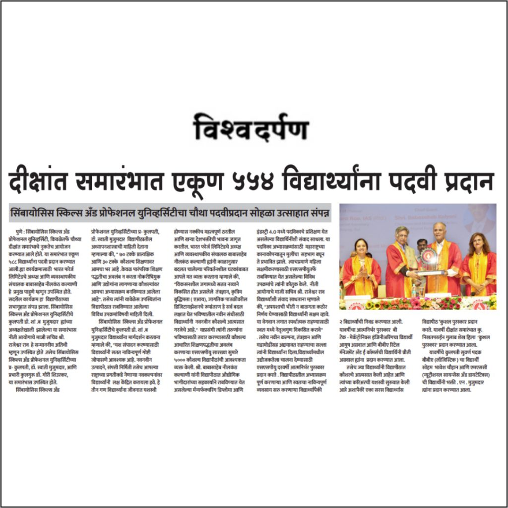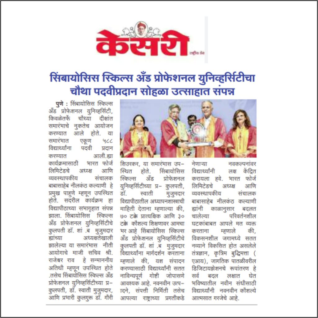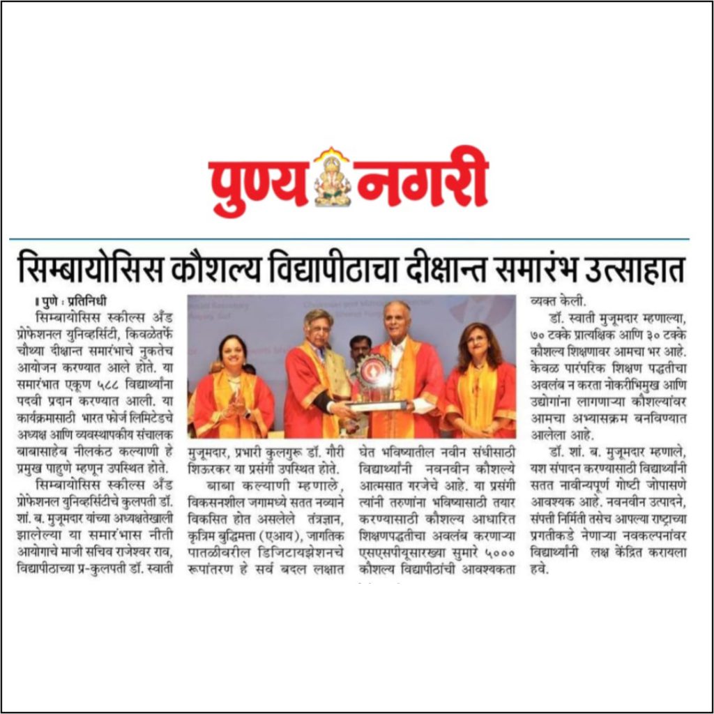 The ceremony was started with Welcome address by Vice Chancellor Dr. Gauri Shiurkar, and Speech by Pro Chancellor of Symbiosis Skills and Professional University Dr. Swati Mujumdar highlighting the importance of Skills and Learning by Doing.