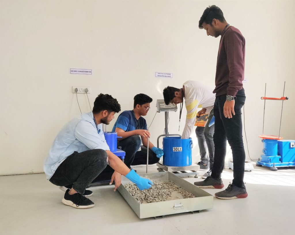The School of Construction Engineering and Infrastructure Management has set up a state-of-the-art Skill Centre on the University campus, providing the students with a live environment to work, understand the industry requirements and specifications and serves a wide spectrum of skill activities – Tiling, Plumbing, Concrete Casting for different structural members, Rebar cutting, Scaffolding, Masonry & Plastering, Safety on-site, etc.