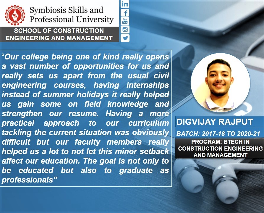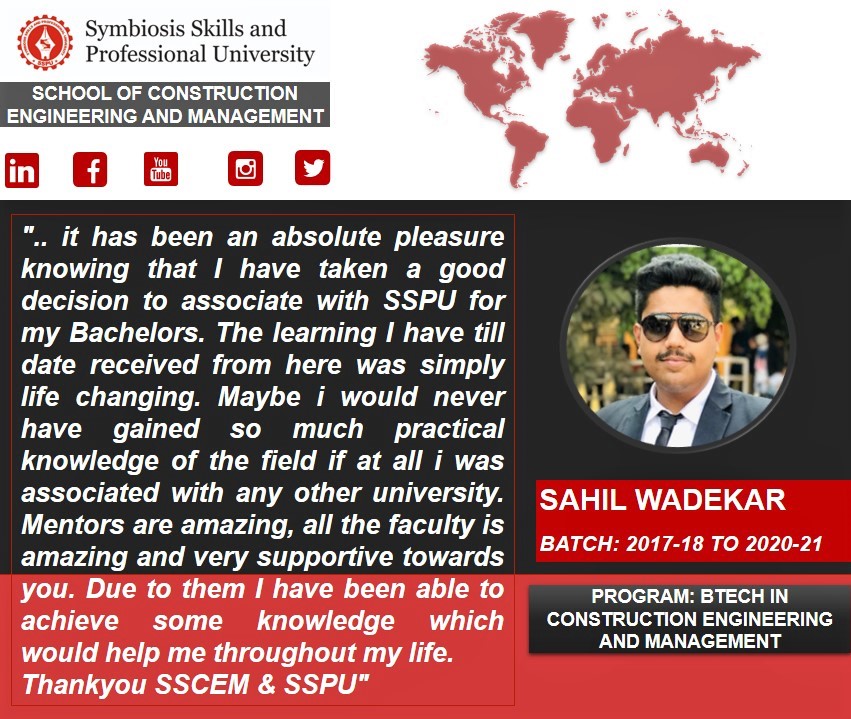 Additionally, the program structure of the School of Construction Engineering & Infrastructure Management incorporates mandatory industry exposure through yearly internships, culminating in an intensive six-month internship in the eighth semester of the degree program. This structured internship framework ensures sustained practical learning, real-time industry engagement, and a seamless transition from academic training to professional practice.