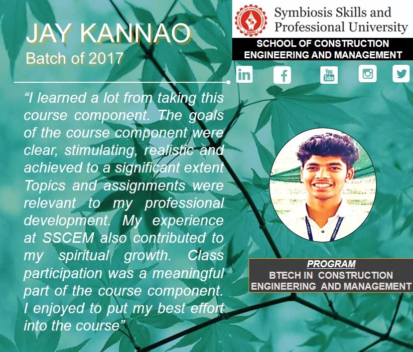 B.Tech Construction Engineering & Management is a program that skills the students and trains them in all aspects of the Construction industry – Planning and Project Management, Execution and Construction Technologies, Structure and its stability, Surveying, Quantity take-offs and billing, Environment and its Management, Geotech and Geological stability and Renewable energy.